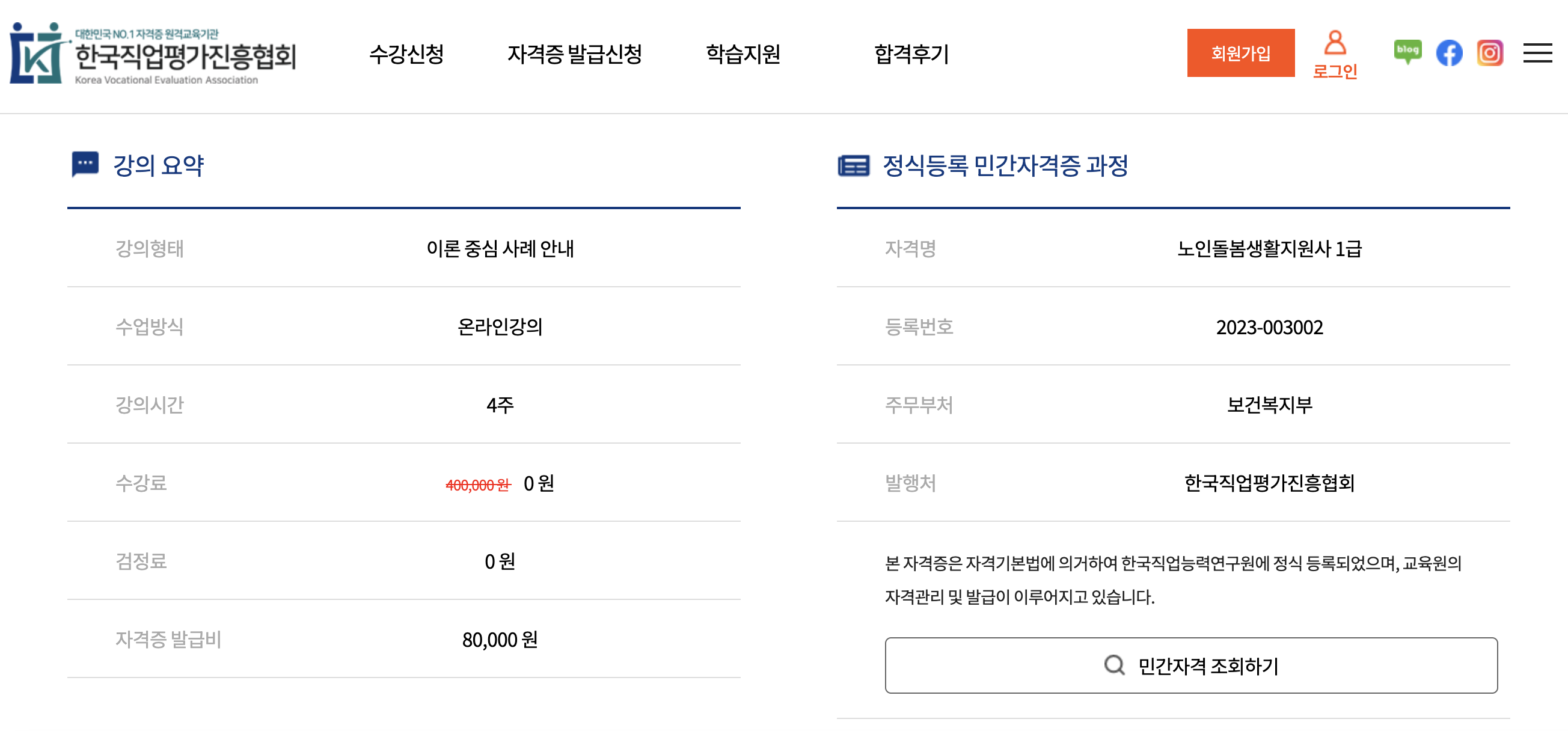 위 교육기관(한국직업평가진흥협회)에서는 강의수강에서 자격증취득까지 대략 한 달정도면 가능하다고 하며, 강의와 교재제공및 시험응시 등은 무료로 제공되지만 자격증 발급비용이 8~9만원 정도 발생합니다.